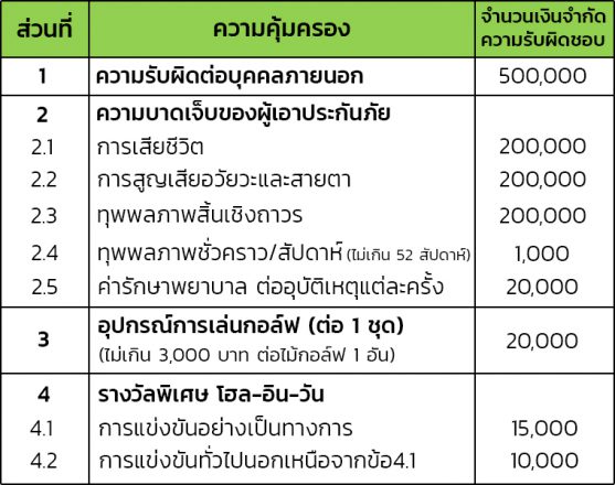 การจราจลนัดหยุดงาน การสึกหรอ หรือเสื่อมสภาพของอุปกรณ์การเล่นกอล์ฟ การสูญเสีย หรือ ความเสียหายของลูกกอล์ฟในขณะฝึกหัด ซ้อมหรือ เล่นกอล์ฟ